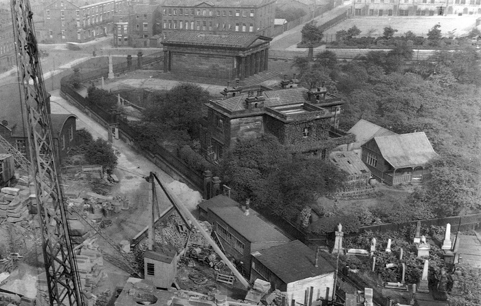 Taken during the construction of Liverpool Cathedral Showing the oratory and minister's house, and the Lower Western Terrace.